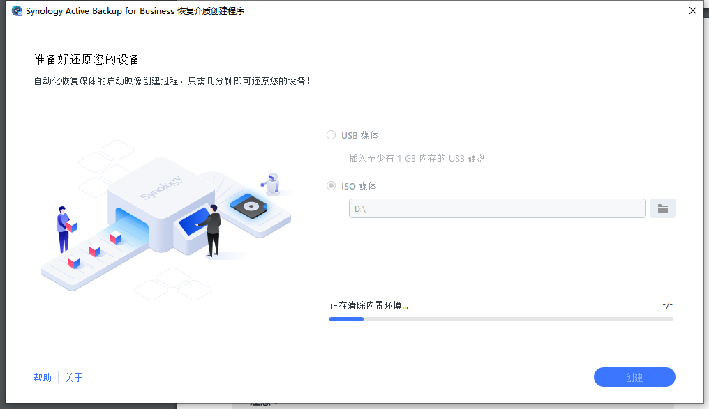 3、制作临时PE进行恢复,装机时使用的PE也可以,进带网络的PE模式下访问群晖网页,访问Active Backup for Business按提示进行还原。我这里因为是虚拟机选择了制作群晖的临时PE,制作教程可参考官方的指南:群晖官方恢复介质创建指南.pdf (如果访问不了,请检查你电脑是不是开了梯子,关掉)。如果是第一次制作,需要安装 Windows ADK 和 WinPE 软件包,软件会提示,跟着走就行。Active Backup for Business恢复程序 跟前面一样去官网搜索,或者在群晖还原界面里面根据提示下载。